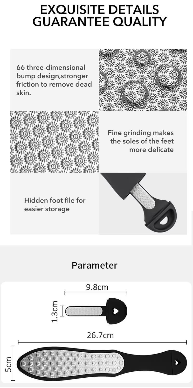 1. מעוצב עם משטח דפוס גלי, לשיוף קל המותאם לעקבי הרגליים ויכול להסיר בקלות את היבלת, העור הסדוק והעור המת, למנוע הצטברות של עור קשה.