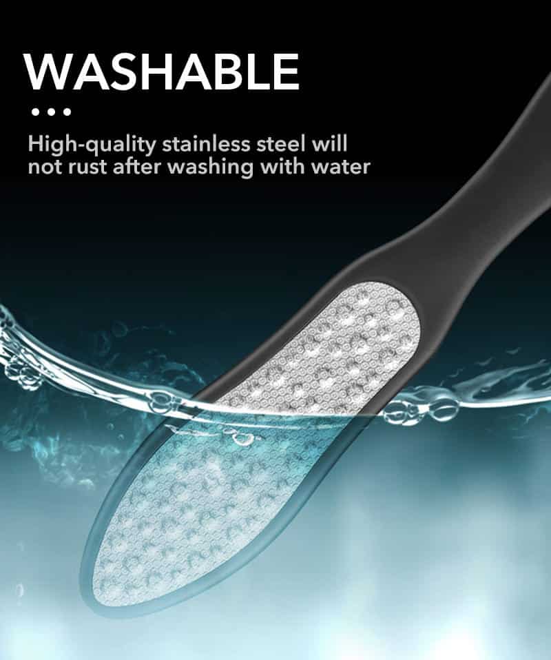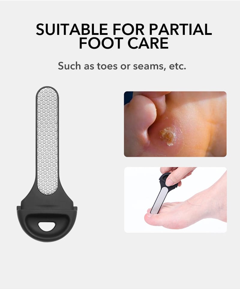 משייף פדיקור מקצועי דו צדדי מנירוסטה לכף הרגל משולב עם משייף עדין מובנה להסרת יבלות וגישה נוחה לשיוף בין האצבעות, נועד להסיר ביעילות עור קשה ועקשן מכפות הרגליים והעקבים.